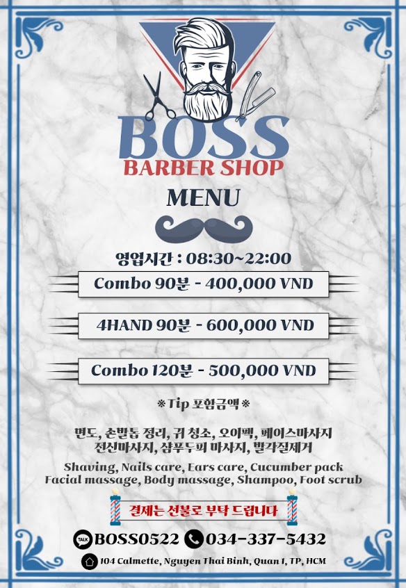 보스 이발소는 2023년 5월 새롭게 오픈한 이발소이다 근처에 대형 급 이발소가 많이 즐비하고 있으나 사실 온라인 홍보 그리고 평균 이상 가는 서비스 실력과 사장님과 직원들의 친절함이면 꾸준하게 고정 고객들을 만들 수 있다고 생각 든다